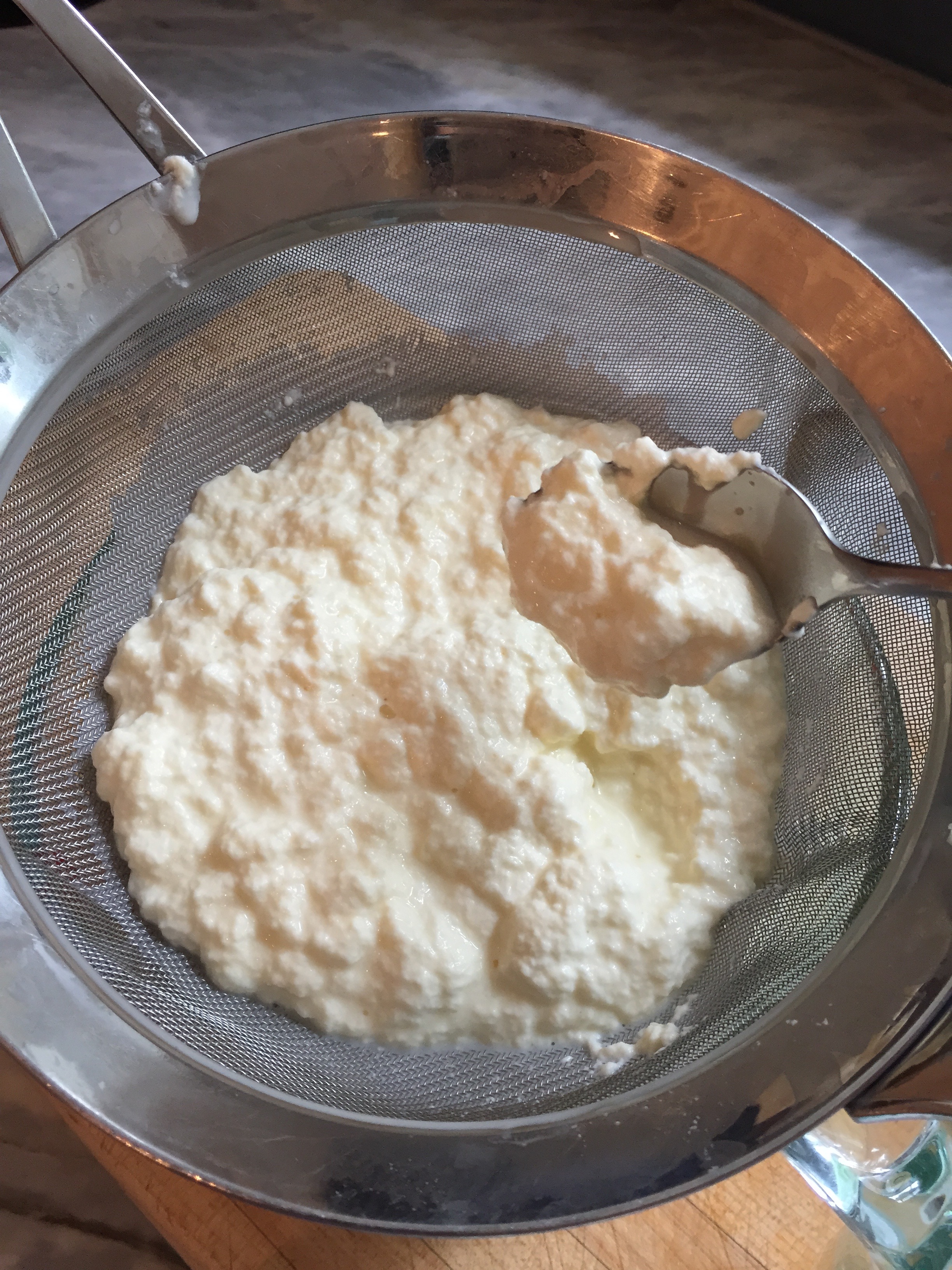 After 10 minutes, use a slotted spoon to transfer the curds to the cheesecloth lined sieve. Once the larger curds have been placed in the sieve, carefully pour the remaining curds/whey into the sieve. Let drain for at least 10 minutes, or until desired consistency is reached. The longer the ricotta drains, the firmer it will be.