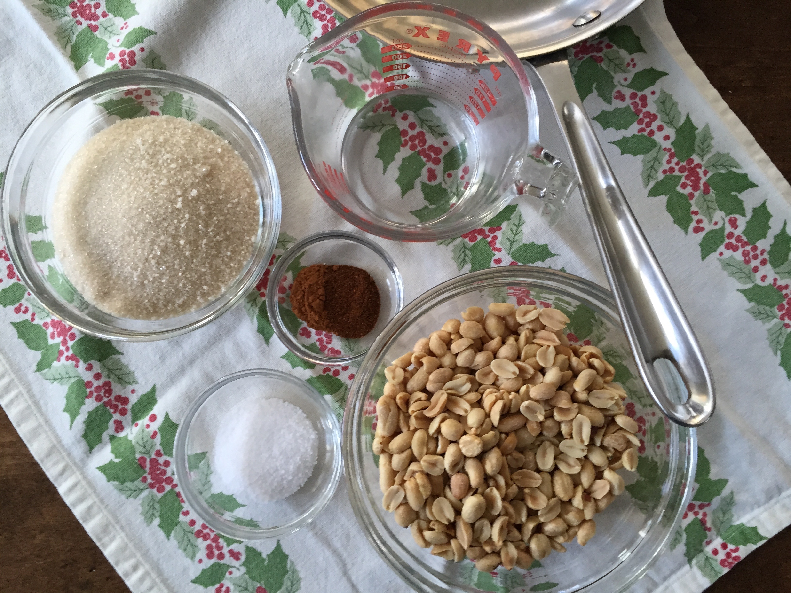 Just five ingredients… peanuts, sugar, water, spices, and salt.Peanuts, sugar, and water are combined in a heavy duty skillet.Over moderate heat, stir peanuts, sugar and water to dissolve sugar.After several minutes, the sugar begins to crystalize.The sugar has crystalized and the nuts appear sandy and dry. Don’t worry!!! This is normal… lower the heat and just keep stirring.The crystalized sugar begins to liquefy forming a deep brown sugar in the bottom of the pan. Continue to stir over low heat to coat all the peanuts in any syrup that forms. Remove from heat if the syrup starts to smoke.Just before the nuts are done stir in spices and sprinkle of salt.Spread the candied peanuts onto silicone mat or parchment lined baking sheet. Allow to cool, and then break up any clumps.If, by chance, you have any leftovers, store them in an airtight container.