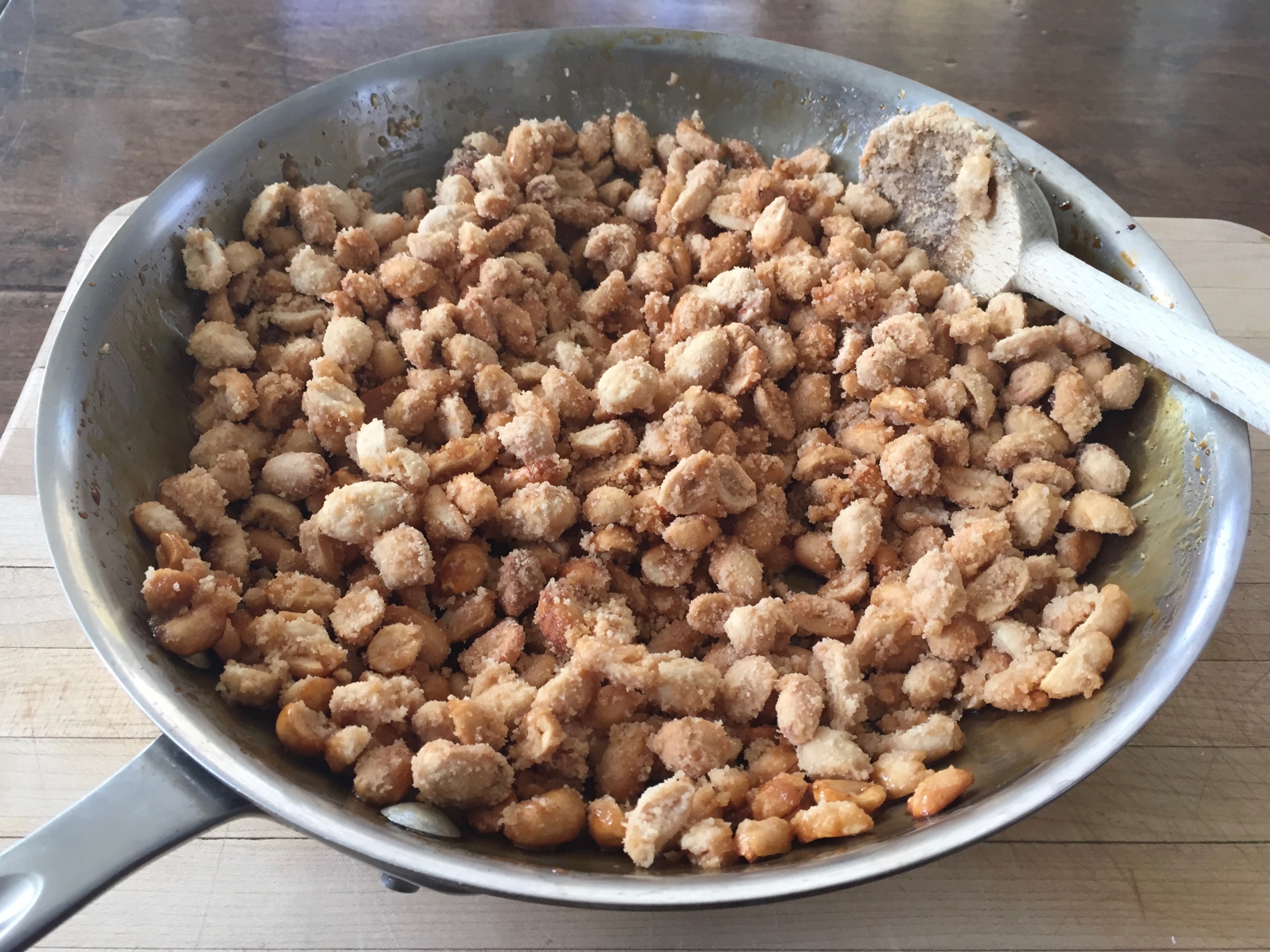 Lower the heat and keep stirring. The crystalized sugar will begin to liquefy again. Stir the peanuts into any syrup forming in the bottom of the pan, coating them as much as possible.