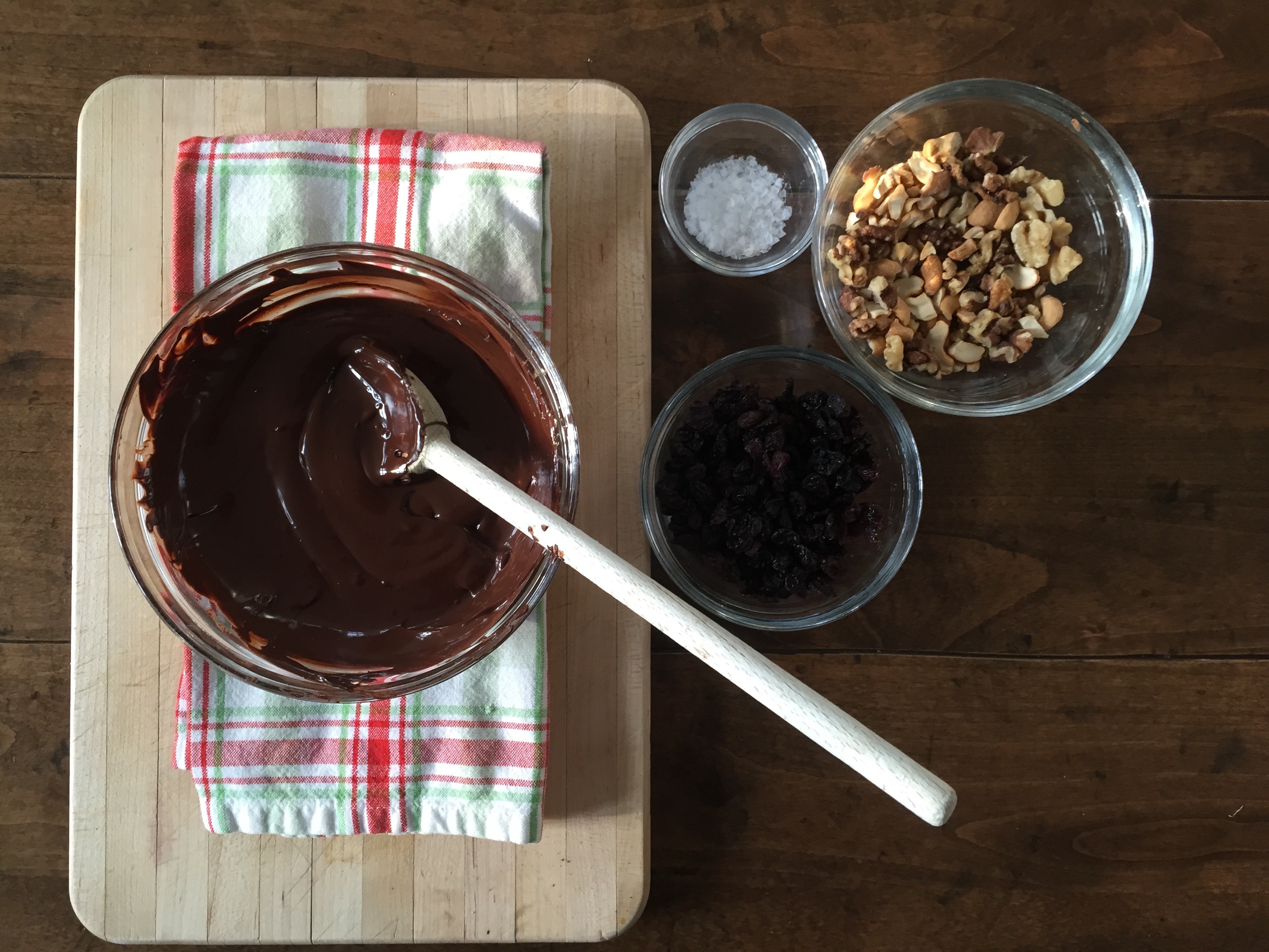 Four ingredients and 15 minutes is all it takes to make chocolate bark.Stirring occasionally, melt the chocolate in a heat proof bowl set over simmering water.The chocolate is melted and ready for the toasted nuts and dried fruit.Stir in half of the toasted nuts and dried fruit.Using an offset spatula, spread the melted chocolate mixture onto a foil line baking sheet. The chocolate should be about 1/4″ thick.While chocolate is still melted, top chocolate bark with remaining toasted nuts and dried fruit. Press lightly to be sure nuts and fruits adhere.Sprinkle pinch of flaky sea salt on top of the chocolate bark.Chill, allowing chocolate bark to completely cool and harden, about 30 minutes. Break into irregular pieces before serving.