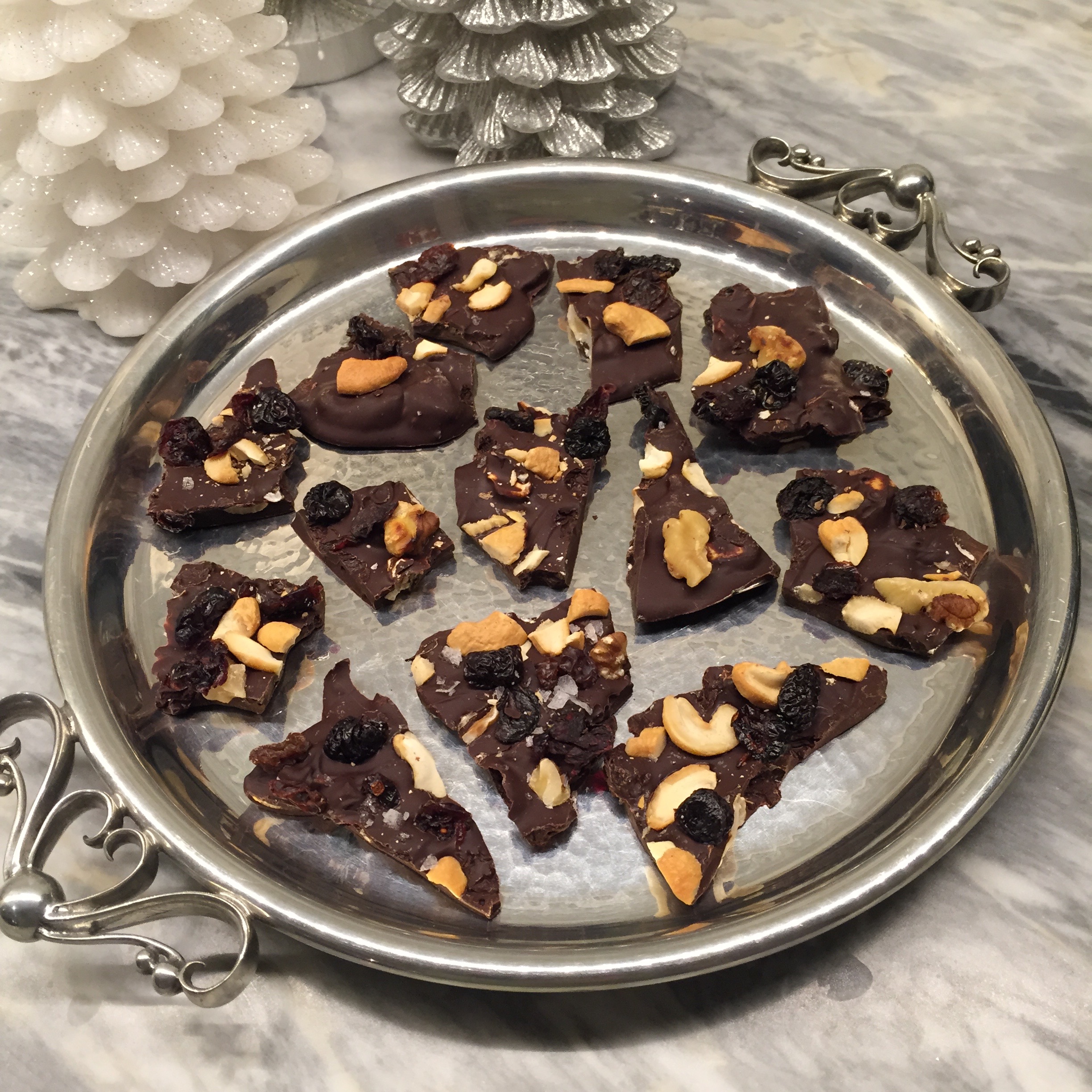Dark Chocolate Bark with Toasted Nuts, Dried Fruit, and Flaky Sea Salt
