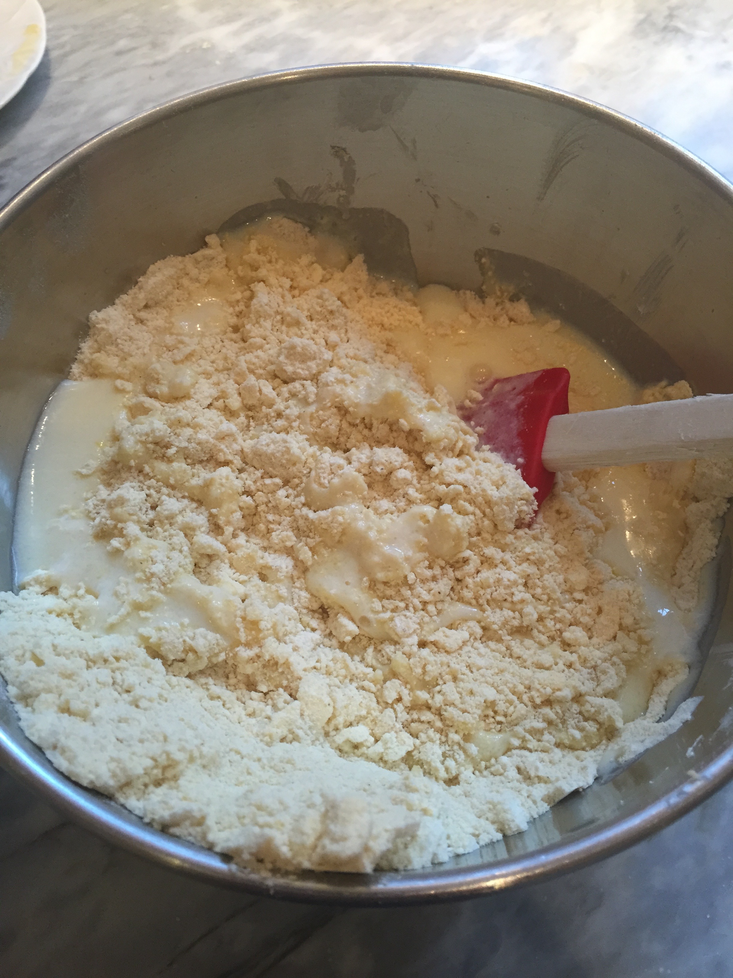Whisk dry ingredients together.Cut softened butter into flour mixture.Fold buttermilk and egg mixture into dry ingredients until just combined.Pour batter into prepared baking dish and bake at 400°F for 25 minutes or until cake tester inserted in center comes out clean.Enjoy!